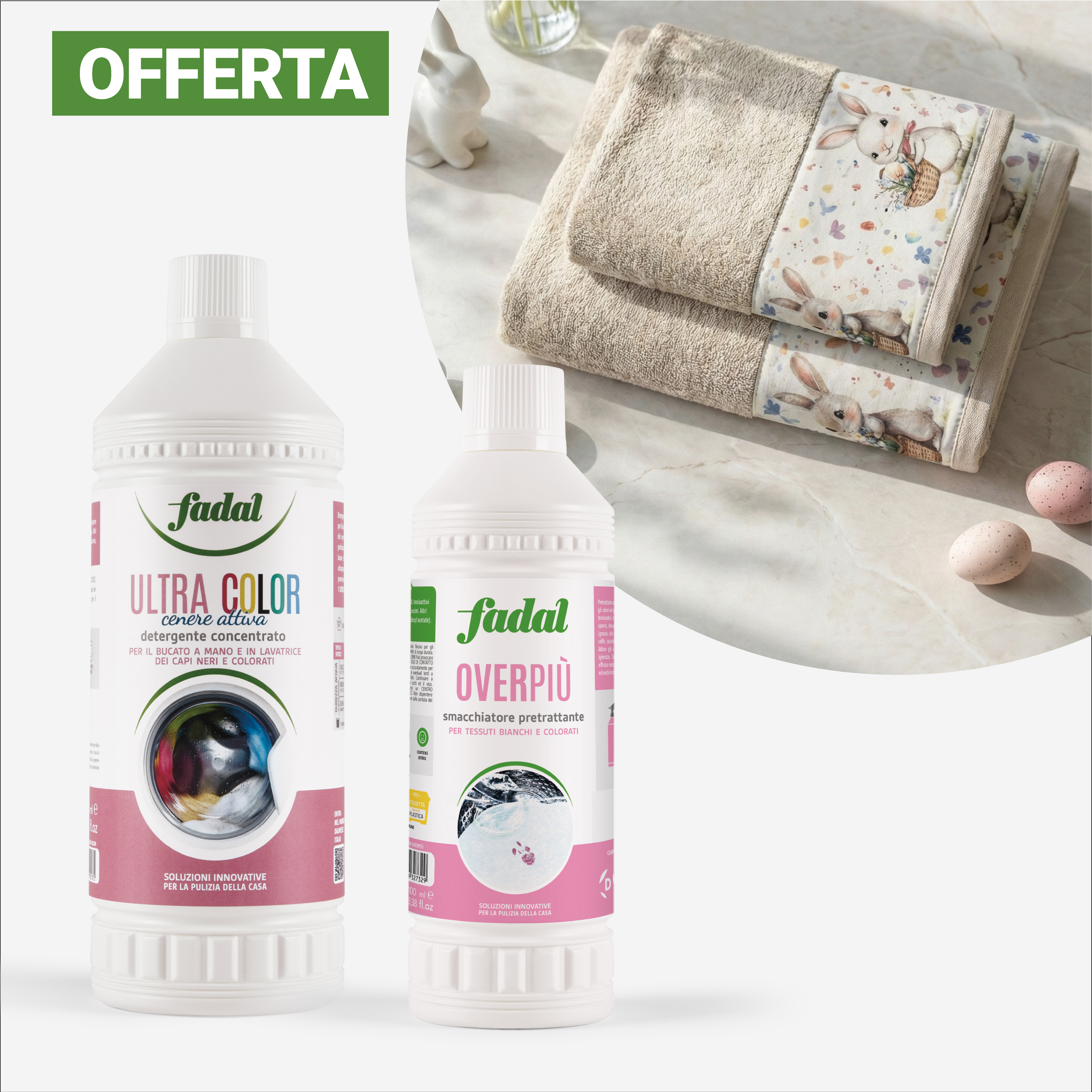 La Pasqua è il momento perfetto per rinnovare gli ambienti, accogliere la primavera e riscoprire il piacere di una casa luminosa, profumata e curata in ogni dettaglio. Con la nostra offerta, il tuo bucato si veste di freschezza, colore e morbidezza grazie a Ultra Color, il detergente liquido concentrato per bucato a mano e in lavatrice. Studiato per i capi neri e colorati, mantiene l’intensità del nero e la brillantezza dei colori, lasciando una gradevole profumazione di cenere attiva e una sensazione di morbidezza. È efficace su tutto lo sporco ed è attivo già a basse temperature (30°–60°). Il suo innovativo complesso di agenti ultrapotenti previene il trasferimento dei colori da un capo all’altro, preservando l’originale intensità e vivacità dei tessuti. Per le macchie più ostinate, Overpiù Smacchiatore Pretrattante agisce in profondità, eliminando sporco e odori nel rispetto delle fibre e dei colori. A completare l’offerta, il raffinato set di asciugamani pasquali in morbida spugna 100% cotone, impreziosito da delicati dettagli decorativi e da una elegante tonalità sabbia, illumina l’ambiente e porta un tocco di stile alla tua casa.